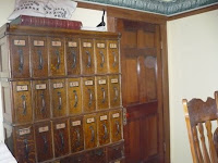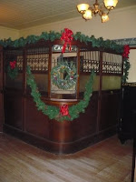 Here is the bank. Decorated for Christmas. Love all the old, heavy wood and beautiful details.