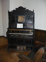 Here is a close-up of the organ. Very ornate and beautiful. Foot pedals.
