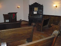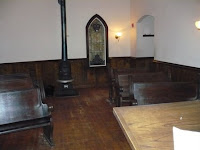 Here’s the church from standing behind the pulpit. Note how SMALL it is. Seating for…maybe 18 if they’re close friends. 🙂Stained glass window, too.