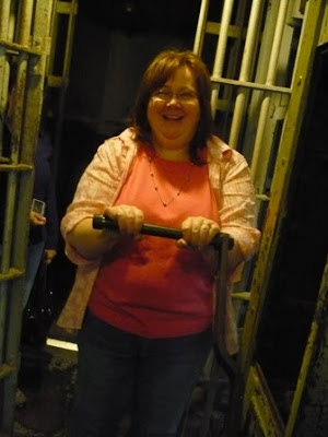 This is Lorna Seilstad, author of the soon to be released historical romance Making Waves. Lorna is demonstrating how to work the crank that turned the entire three story jail. One person could do it alone. As it says above, maximum security with minimum jailer attention.